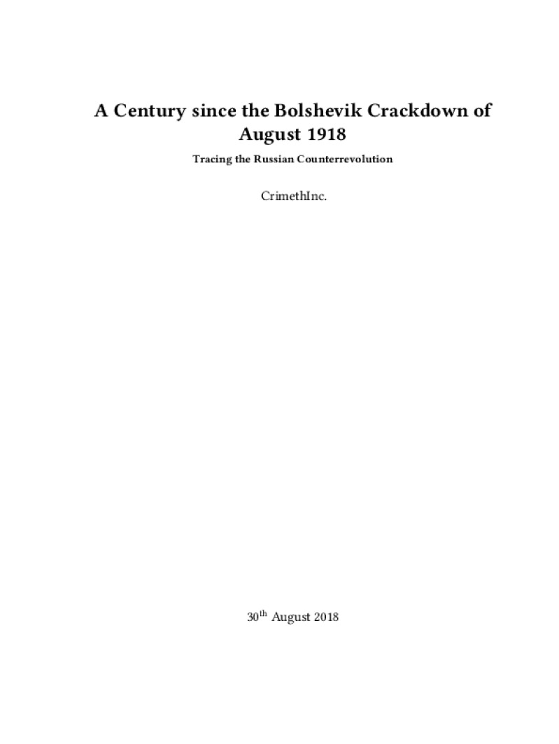 Zine A Century since the Bolshevik Crackdown of August 1918 Author: CrimethInc.Published: 30th August 2018Language: enCatalog: The Anarchist Library11 pages. Read online: html • pdf •imposed pdf • a4 pdf • epub • muse • tex Share: We mail all zines to incarcerated people for free.