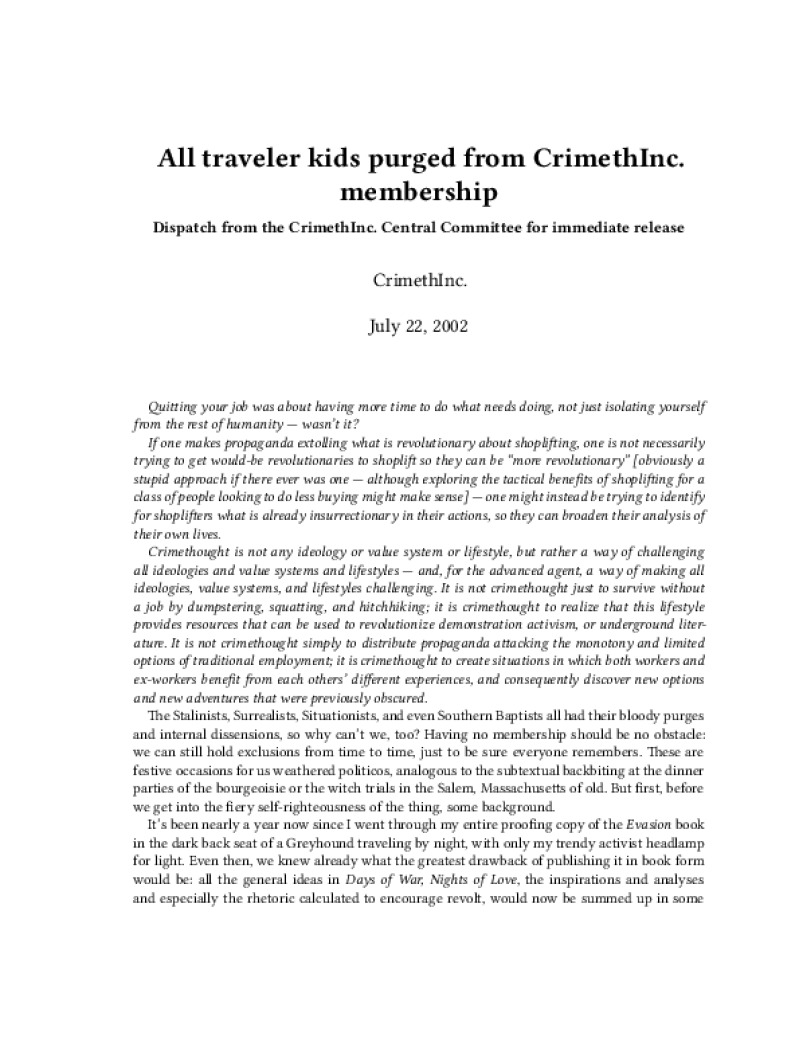 Zine All traveler kids purged from CrimethInc. membership Author: CrimethInc.Published: July 22, 2002Language: enCatalog: The Anarchist Library4 pages. Read online: html • pdf •imposed pdf • a4 pdf • epub • muse • tex Share: We mail all zines to incarcerated people for free.
