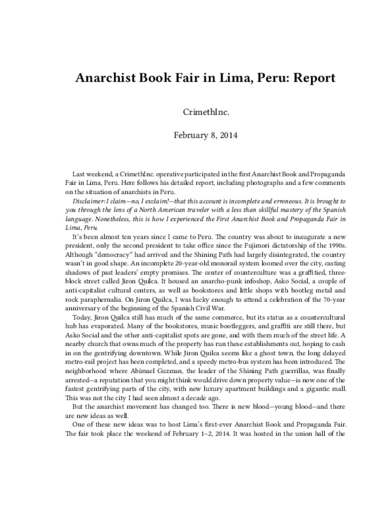 Zine Anarchist Book Fair in Lima, Peru: Report Author: CrimethInc.Published: February 8, 2014Language: enCatalog: The Anarchist Library5 pages. Read online: html • pdf •imposed pdf • a4 pdf • epub • muse • tex Share: We mail all zines to incarcerated people for free.