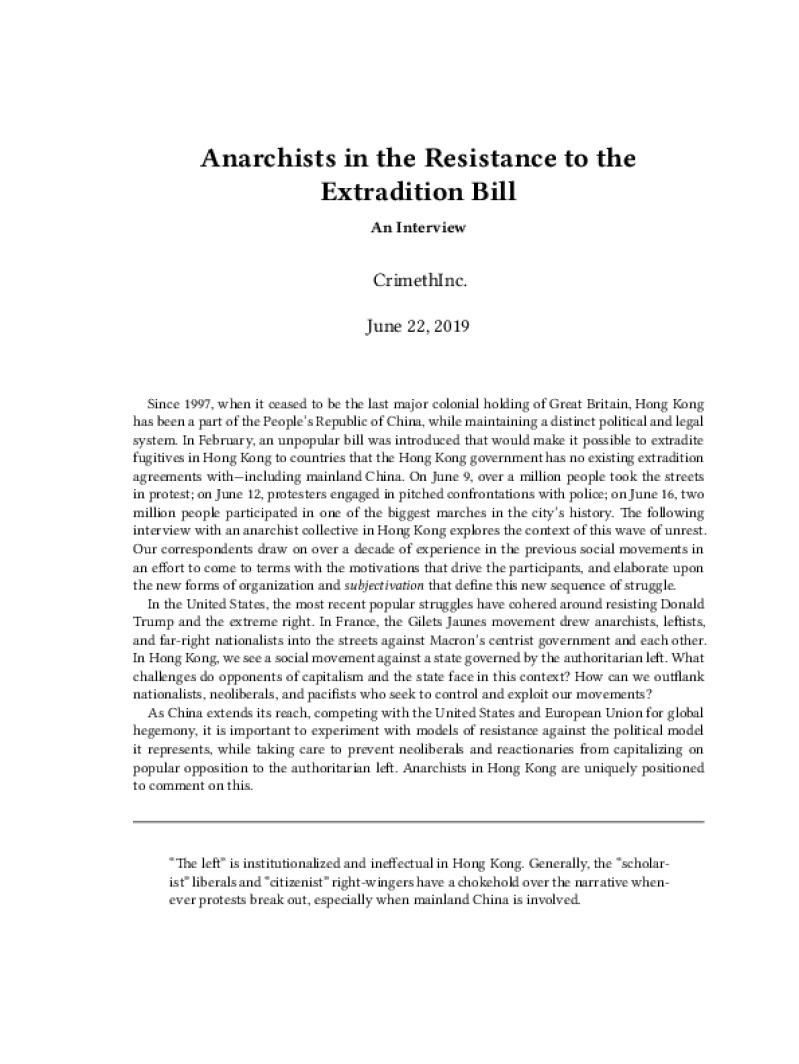Zine Anarchists in the Resistance to the Extradition Bill Author: CrimethInc.Published: June 22, 2019Language: enCatalog: The Anarchist Library12 pages. Read online: html • pdf •imposed pdf • a4 pdf • epub • muse • tex Share: We mail all zines to incarcerated people for free.