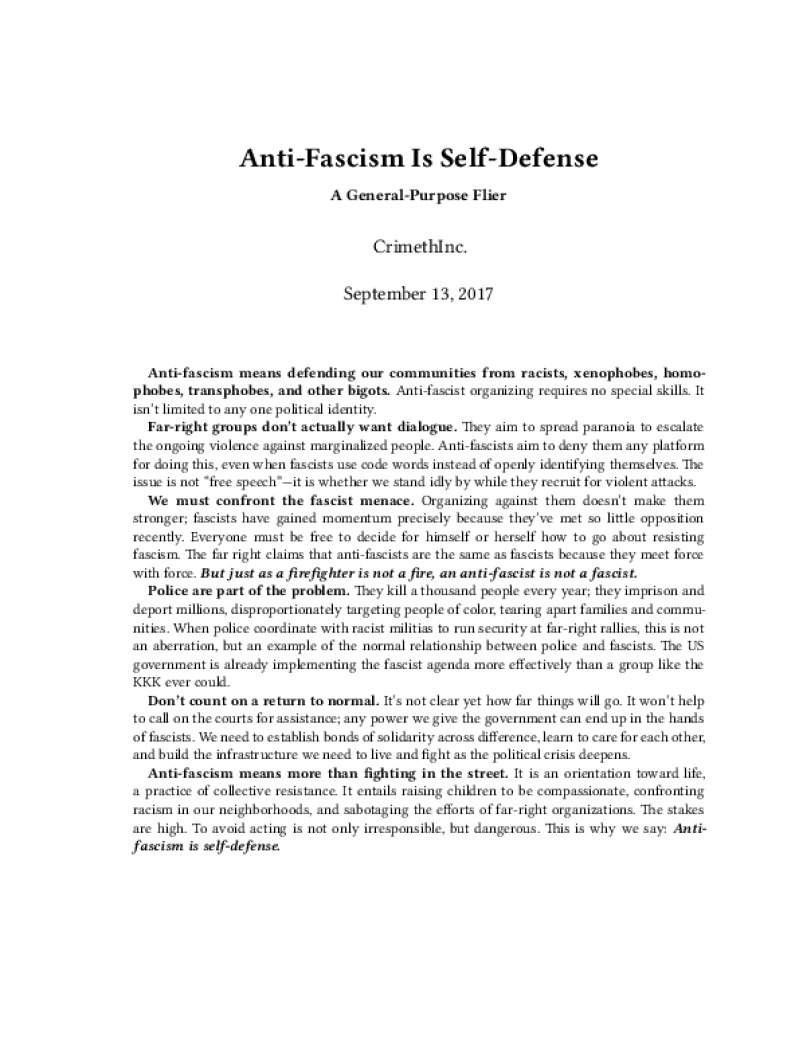 Zine Anti-Fascism Is Self-Defense Author: CrimethInc.Published: September 13, 2017Language: enCatalog: The Anarchist Library2 pages. Read online: html • pdf •imposed pdf • a4 pdf • epub • muse • tex Share: We mail all zines to incarcerated people for free.