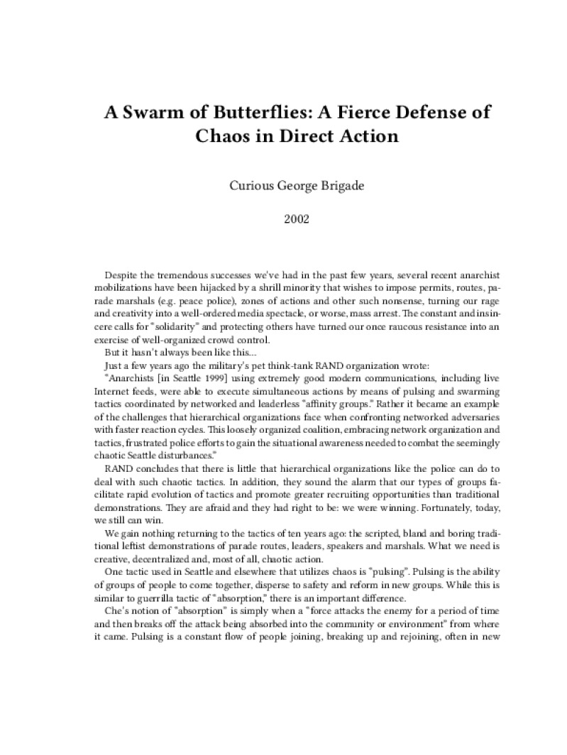 Zine A Swarm of Butterflies: A Fierce Defense of Chaos in Direct Action Author: Curious George BrigadePublished: 2002Language: enCatalog: The Anarchist Library3 pages. Read online: html • pdf •imposed pdf • a4 pdf • epub • muse • tex Share: We mail all zines to incarcerated people for free.