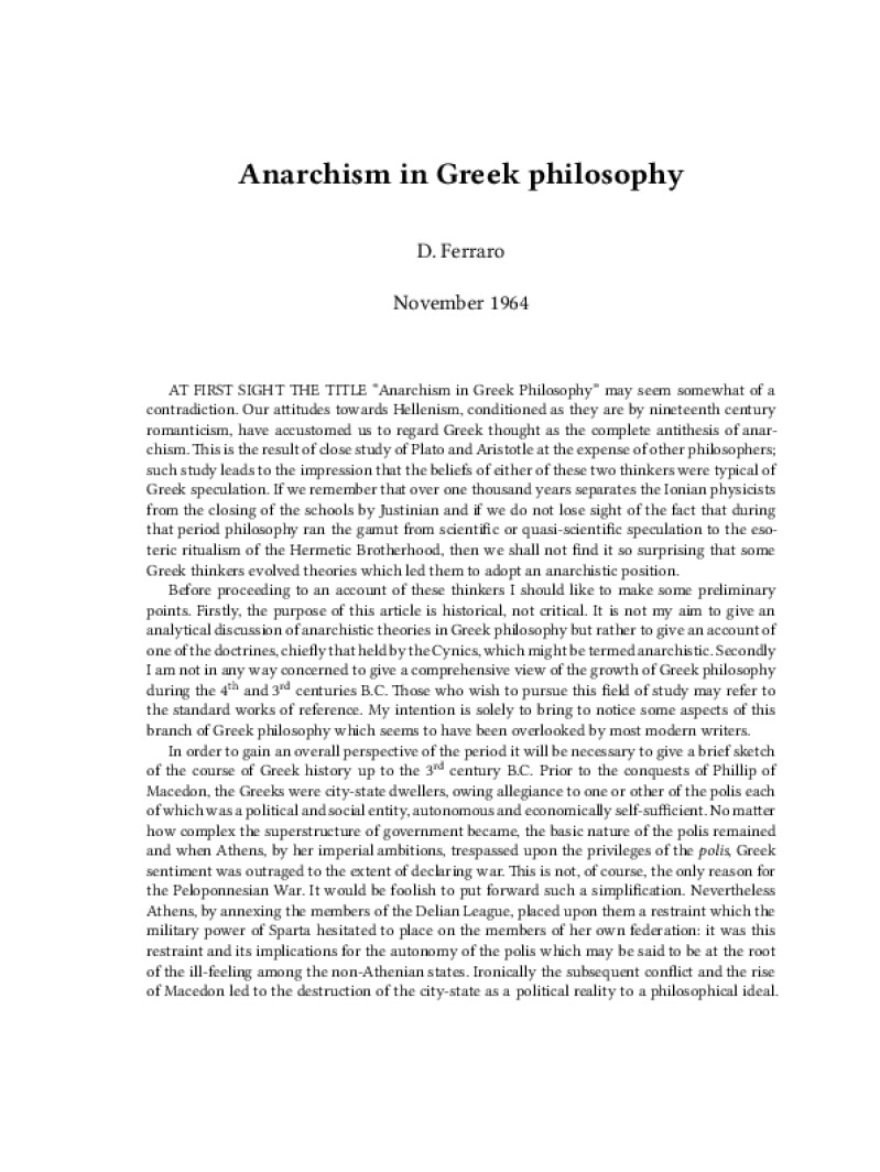 Zine Anarchism in Greek philosophy Author: D. FerraroPublished: November 1964Language: enCatalog: The Anarchist Library5 pages. Read online: html • pdf •imposed pdf • a4 pdf • epub • muse • tex Share: We mail all zines to incarcerated people for free.
