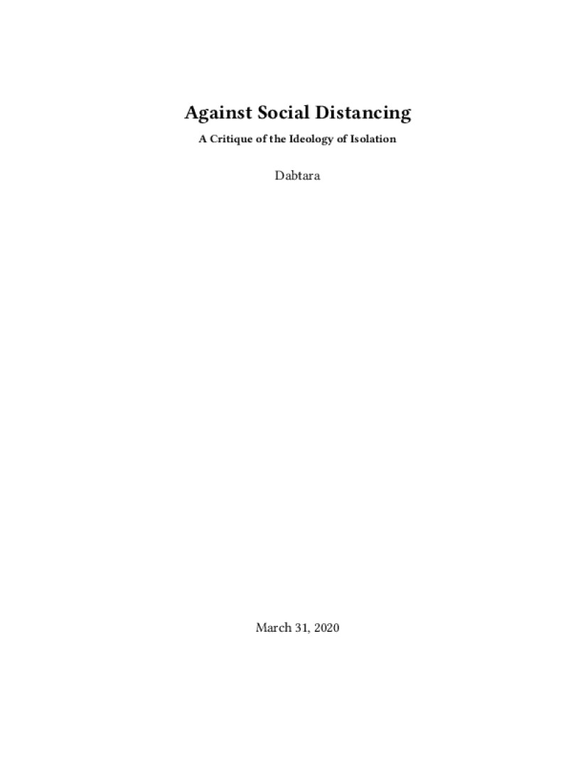 Zine Against Social Distancing Author: DabtaraPublished: March 31, 2020Language: enCatalog: The Anarchist Library8 pages. Read online: html • pdf •imposed pdf • a4 pdf • epub • muse • tex Share: We mail all zines to incarcerated people for free.
