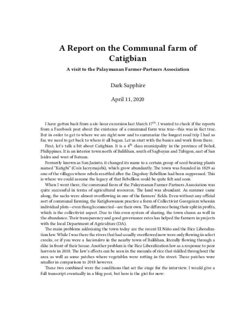 Zine A Report on the Communal farm of Catigbian Author: Dark SapphirePublished: April 11, 2020Language: enCatalog: The Anarchist Library4 pages. Read online: html • pdf •imposed pdf • a4 pdf • epub • muse • tex Share: We mail all zines to incarcerated people for free.