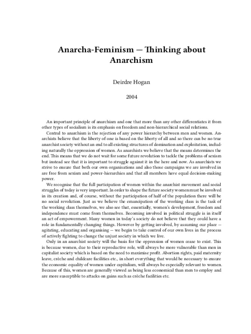 Zine Anarcha-Feminism — Thinking about Anarchism Author: Deirdre HoganPublished: 2004Language: enCatalog: The Anarchist Library3 pages. Read online: html • pdf •imposed pdf • a4 pdf • epub • muse • tex Share: We mail all zines to incarcerated people for free.