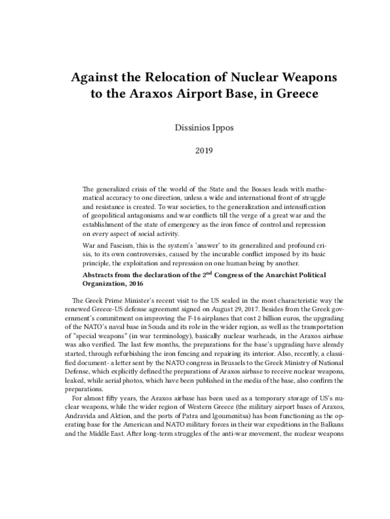 Zine Against the Relocation of Nuclear Weapons to the Araxos Airport Base, in Greece Author: Dissinios IpposPublished: 2019Language: enCatalog: The Anarchist Library5 pages. Read online: html • pdf •imposed pdf • a4 pdf • epub • muse • tex Share: We mail all zines to incarcerated people for free.