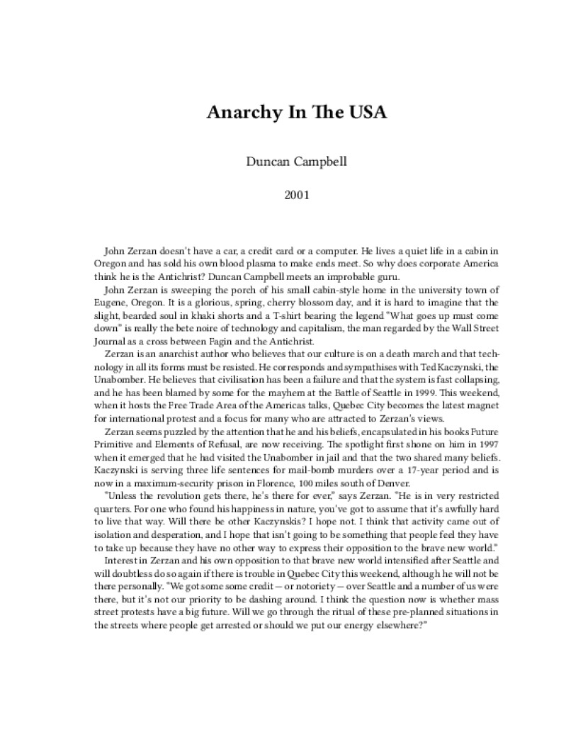 Zine Anarchy In The USA Author: Duncan CampbellPublished: 2001Language: enCatalog: The Anarchist Library5 pages. Read online: html • pdf •imposed pdf • a4 pdf • epub • muse • tex Share: We mail all zines to incarcerated people for free.