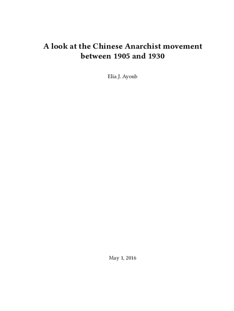 Zine A look at the Chinese Anarchist movement between 1905 and 1930 Author: Elia J. AyoubPublished: May 1, 2016Language: enCatalog: The Anarchist Library8 pages. Read online: html • pdf •imposed pdf • a4 pdf • epub • muse • tex Share: We mail all zines to incarcerated people for free.