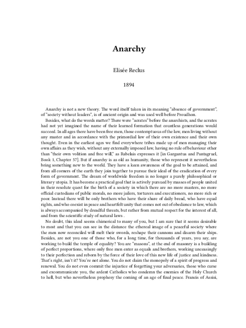 Zine Anarchy Author: Elisée ReclusPublished: 1894Language: enCatalog: The Anarchist Library10 pages. Read online: html • pdf •imposed pdf • a4 pdf • epub • muse • tex Share: We mail all zines to incarcerated people for free.