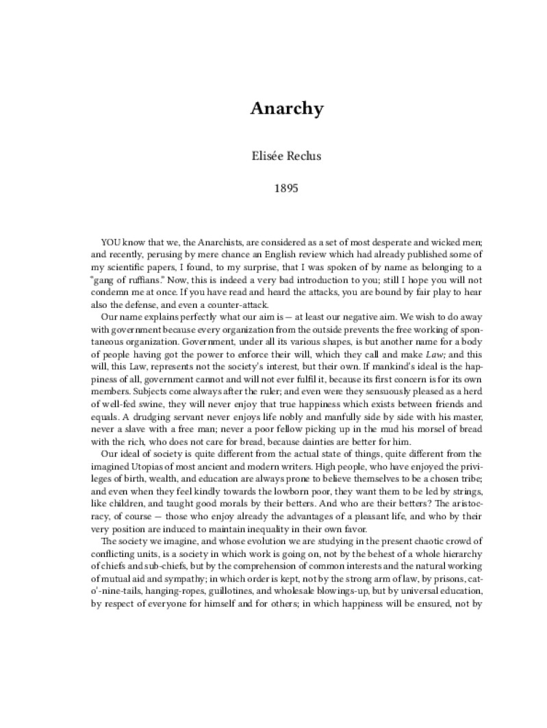 Zine Anarchy Author: Elisée ReclusPublished: 1895Language: enCatalog: The Anarchist Library5 pages. Read online: html • pdf •imposed pdf • a4 pdf • epub • muse • tex Share: We mail all zines to incarcerated people for free.