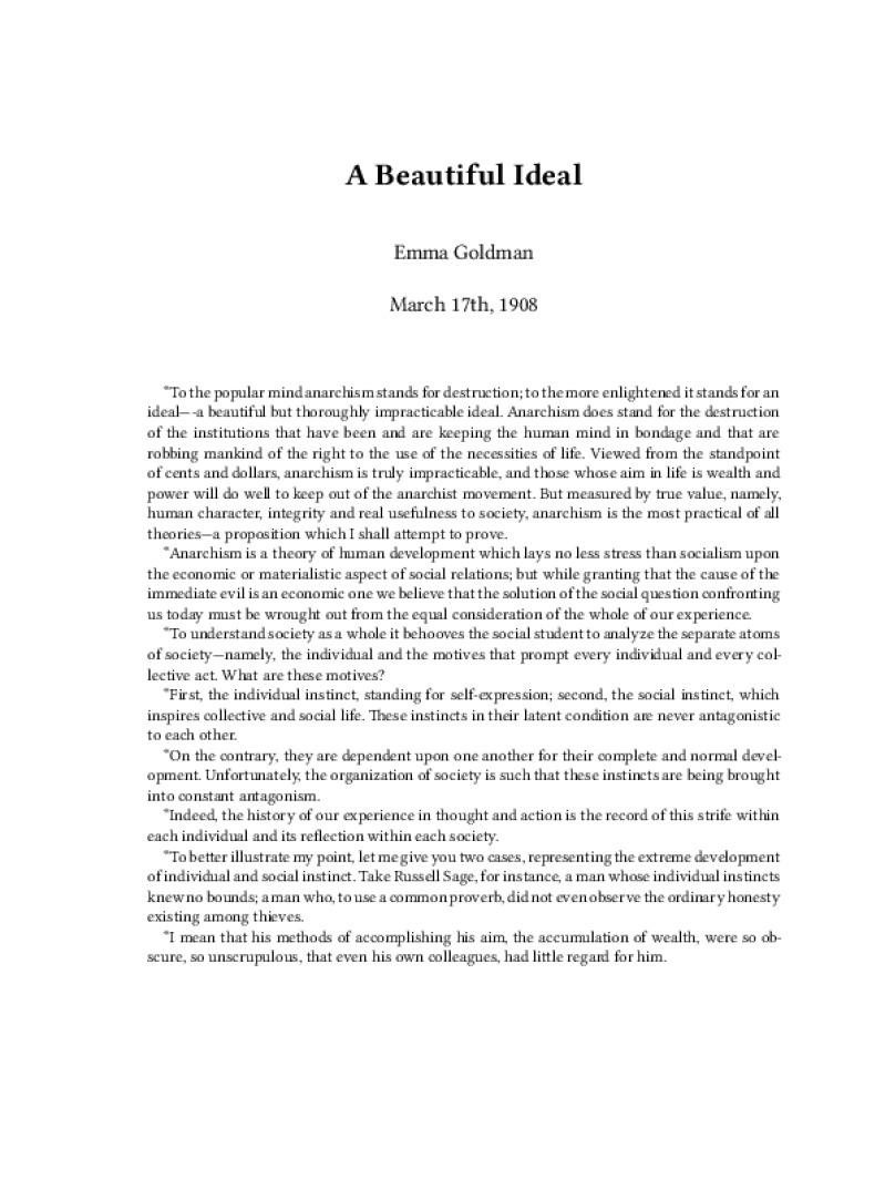 Zine A Beautiful Ideal Author: Emma GoldmanPublished: March 17th, 1908Language: enCatalog: The Anarchist Library4 pages. Read online: html • pdf •imposed pdf • a4 pdf • epub • muse • tex Share: We mail all zines to incarcerated people for free.