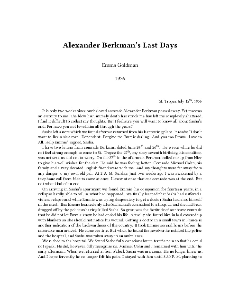 Zine Alexander Berkman’s Last Days Author: Emma GoldmanPublished: 1936Language: enCatalog: The Anarchist Library3 pages. Read online: html • pdf •imposed pdf • a4 pdf • epub • muse • tex Share: We mail all zines to incarcerated people for free.