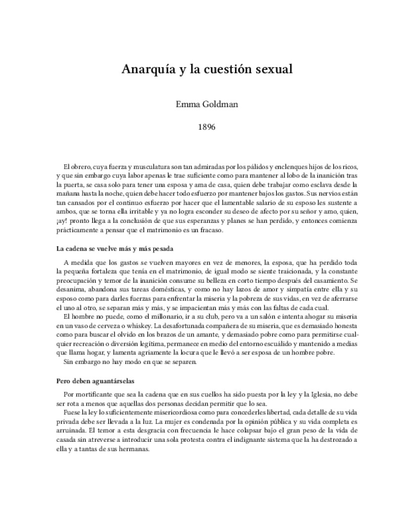 Zine Anarquía y la cuestión sexual Author: Emma GoldmanPublished: 1896Language: esCatalog: The Anarchist Library4 pages. Read online: html • pdf •imposed pdf • a4 pdf • epub • muse • tex Share: We mail all zines to incarcerated people for free.