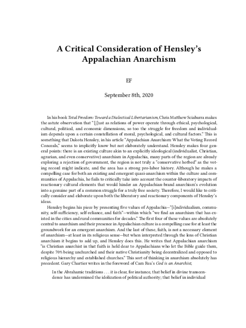 Zine A Critical Consideration of Hensley’s Appalachian Anarchism Author: EFPublished: September 8th, 2020Language: enCatalog: The Anarchist Library9 pages. Read online: html • pdf •imposed pdf • a4 pdf • epub • muse • tex Share: We mail all zines to incarcerated people for free.