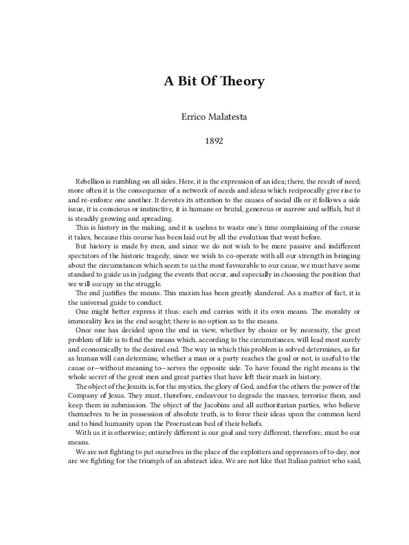 Zine A Bit Of Theory Author: Errico MalatestaPublished: 1892Language: enCatalog: The Anarchist Library5 pages. Read online: html • pdf •imposed pdf • a4 pdf • epub • muse • tex Share: We mail all zines to incarcerated people for free.