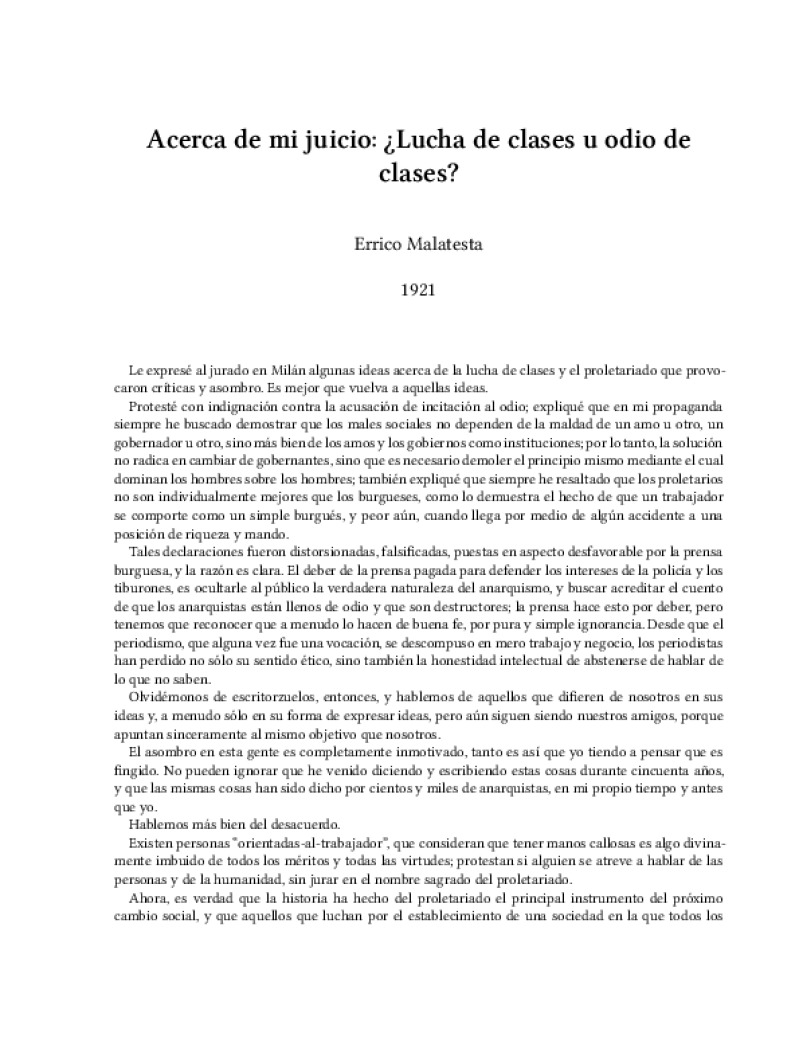 Zine Acerca de mi juicio: żLucha de clases u odio de clases? Author: Errico Malatesta Published: 1921Language: esCatalog: The Anarchist Library3 pages. Read online: html • pdf •imposed pdf • a4 pdf • epub • muse • tex Share: We mail all zines to incarcerated people for free.