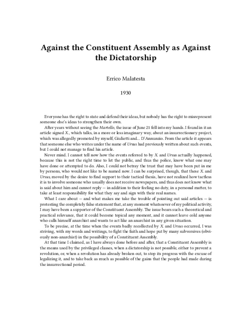 Zine Against the Constituent Assembly as Against the Dictatorship Author: Errico MalatestaPublished: 1930Language: enCatalog: The Anarchist Library4 pages. Read online: html • pdf •imposed pdf • a4 pdf • epub • muse • tex Share: We mail all zines to incarcerated people for free.