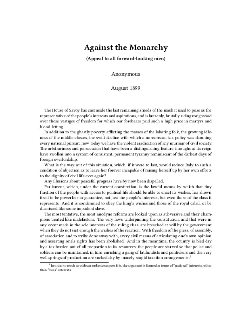 Zine Against the Monarchy Author: AnonymousPublished: August 1899Language: enCatalog: The Anarchist Library7 pages. Read online: html • pdf •imposed pdf • a4 pdf • epub • muse • tex Share: We mail all zines to incarcerated people for free.
