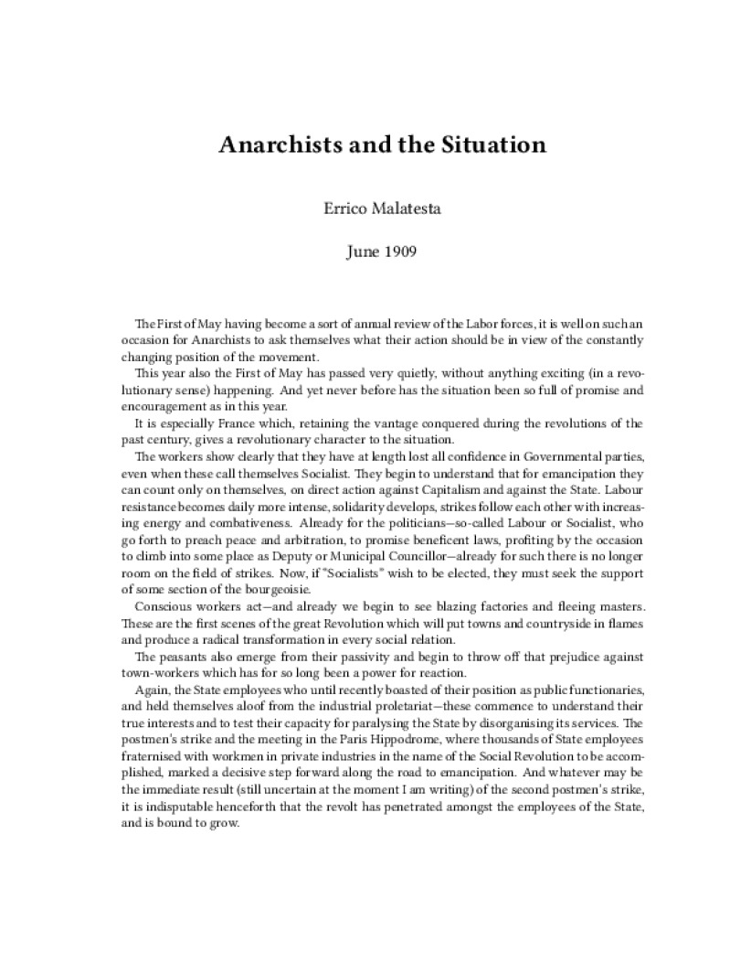 Zine Anarchists and the Situation Author: Errico MalatestaPublished: June 1909Language: enCatalog: The Anarchist Library4 pages. Read online: html • pdf •imposed pdf • a4 pdf • epub • muse • tex Share: We mail all zines to incarcerated people for free.