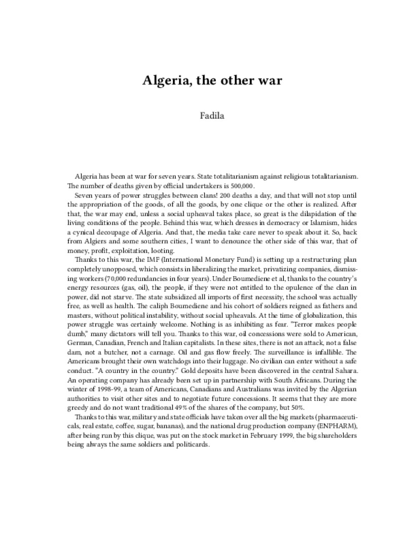 Zine Algeria, the other war Author: FadilaLanguage: enCatalog: The Anarchist Library4 pages. Read online: html • pdf •imposed pdf • a4 pdf • epub • muse • tex Share: We mail all zines to incarcerated people for free.