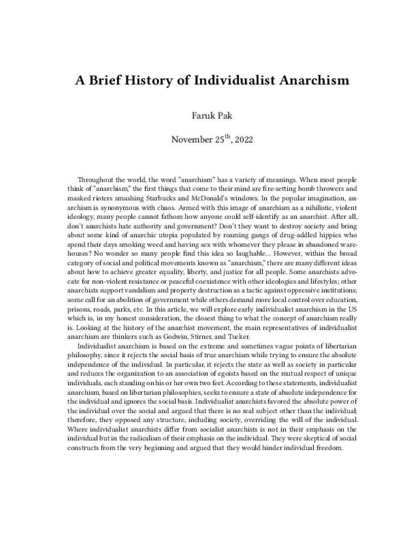 Zine A Brief History of Individualist Anarchism Author: Faruk PakPublished: November 25th, 2022Language: enCatalog: The Anarchist Library5 pages. Read online: html • pdf •imposed pdf • a4 pdf • epub • muse • tex Share: We mail all zines to incarcerated people for free.