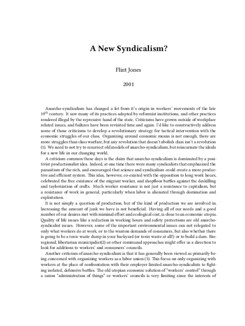 Zine A New Syndicalism? Author: Flint JonesPublished: 2001Language: enCatalog: The Anarchist Library6 pages. Read online: html • pdf •imposed pdf • a4 pdf • epub • muse • tex Share: We mail all zines to incarcerated people for free.