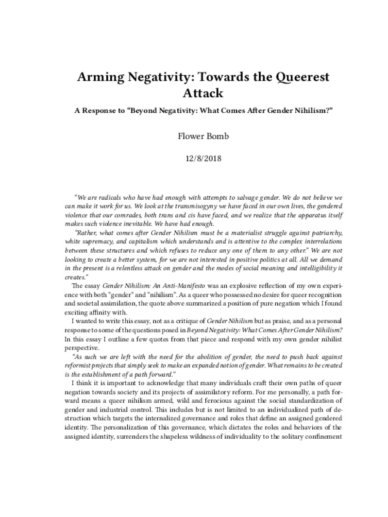 Zine Arming Negativity: Towards the Queerest Attack Author: Flower BombPublished: 12/8/2018Language: enCatalog: The Anarchist Library5 pages. Read online: html • pdf •imposed pdf • a4 pdf • epub • muse • tex Share: We mail all zines to incarcerated people for free.
