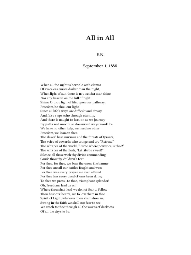 Zine All in All Author: E.N.Published: September 1, 1888Language: enCatalog: The Anarchist Library3 pages. Read online: html • pdf •imposed pdf • a4 pdf • epub • muse • tex Share: We mail all zines to incarcerated people for free.