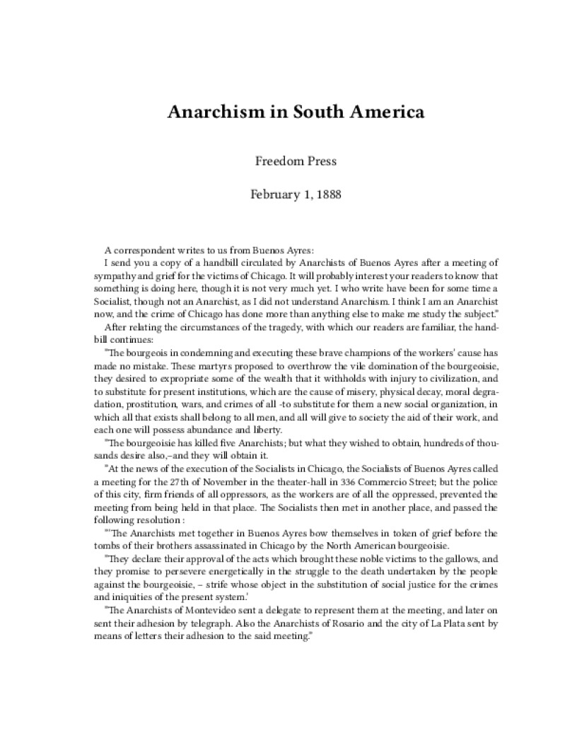 Zine Anarchism in South America Author: Freedom PressPublished: February 1, 1888Language: enCatalog: The Anarchist Library2 pages. Read online: html • pdf •imposed pdf • a4 pdf • epub • muse • tex Share: We mail all zines to incarcerated people for free.