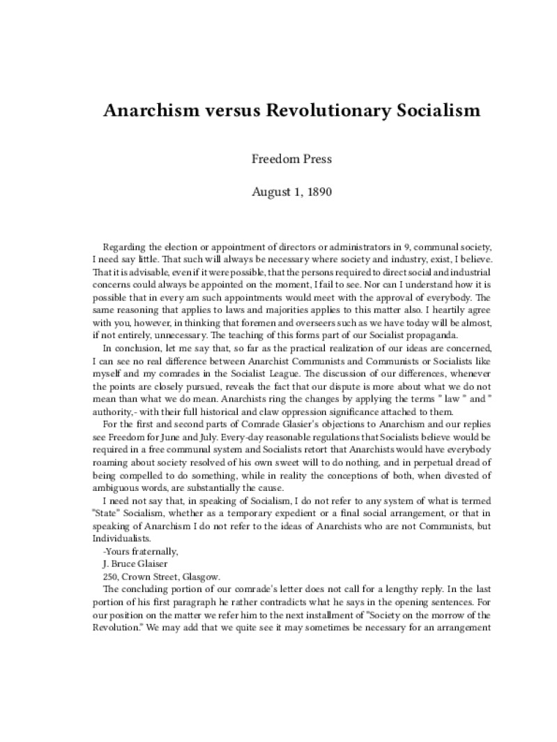 Zine Anarchism versus Revolutionary Socialism Author: Freedom PressPublished: August 1, 1890Language: enCatalog: The Anarchist Library3 pages. Read online: html • pdf •imposed pdf • a4 pdf • epub • muse • tex Share: We mail all zines to incarcerated people for free.