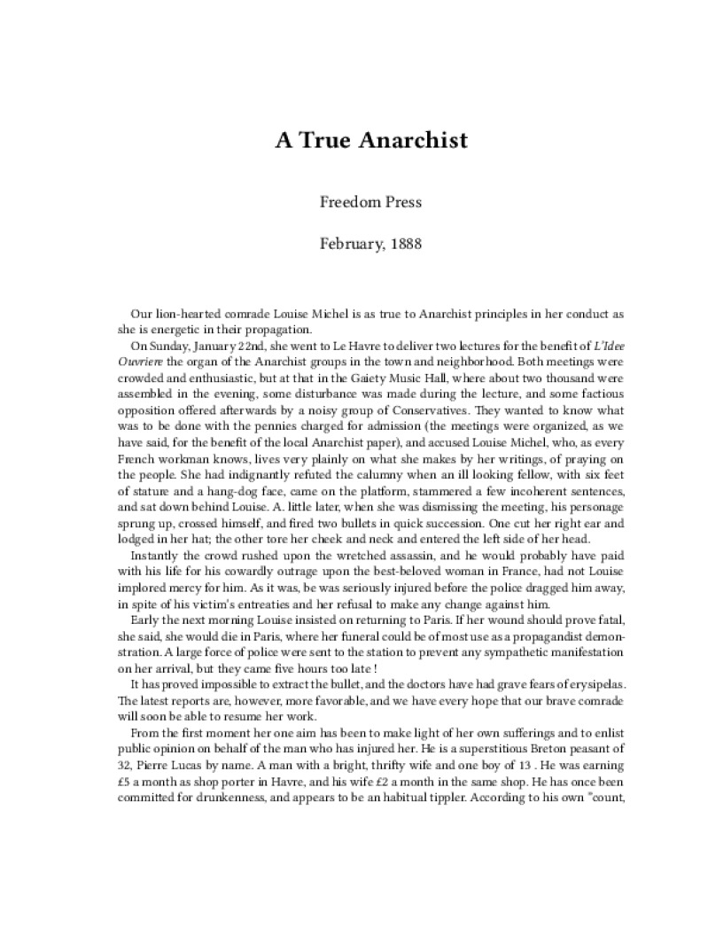 Zine A True Anarchist Author: Freedom PressPublished: February, 1888Language: enCatalog: The Anarchist Library4 pages. Read online: html • pdf •imposed pdf • a4 pdf • epub • muse • tex Share: We mail all zines to incarcerated people for free.