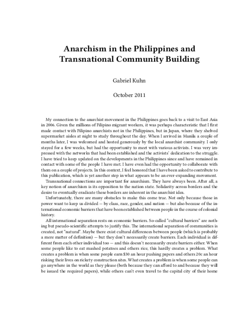 Zine Anarchism in the Philippines and Transnational Community Building Author: Gabriel KuhnPublished: October 2011Language: enCatalog: The Anarchist Library6 pages. Read online: html • pdf •imposed pdf • a4 pdf • epub • muse • tex Share: We mail all zines to incarcerated people for free.