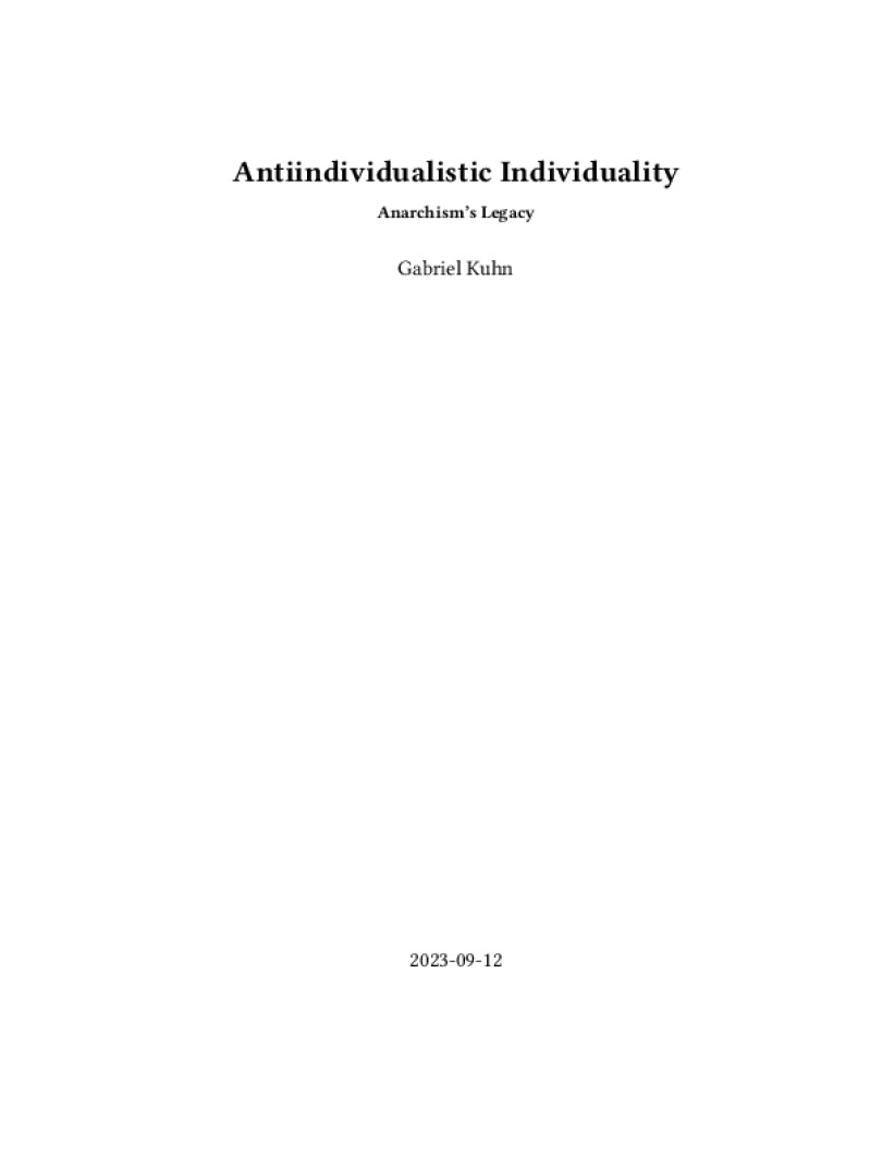 Zine Antiindividualistic Individuality Author: Gabriel KuhnPublished: 2023-09-12Language: enCatalog: The Anarchist Library15 pages. Read online: html • pdf •imposed pdf • a4 pdf • epub • muse • tex Share: We mail all zines to incarcerated people for free.