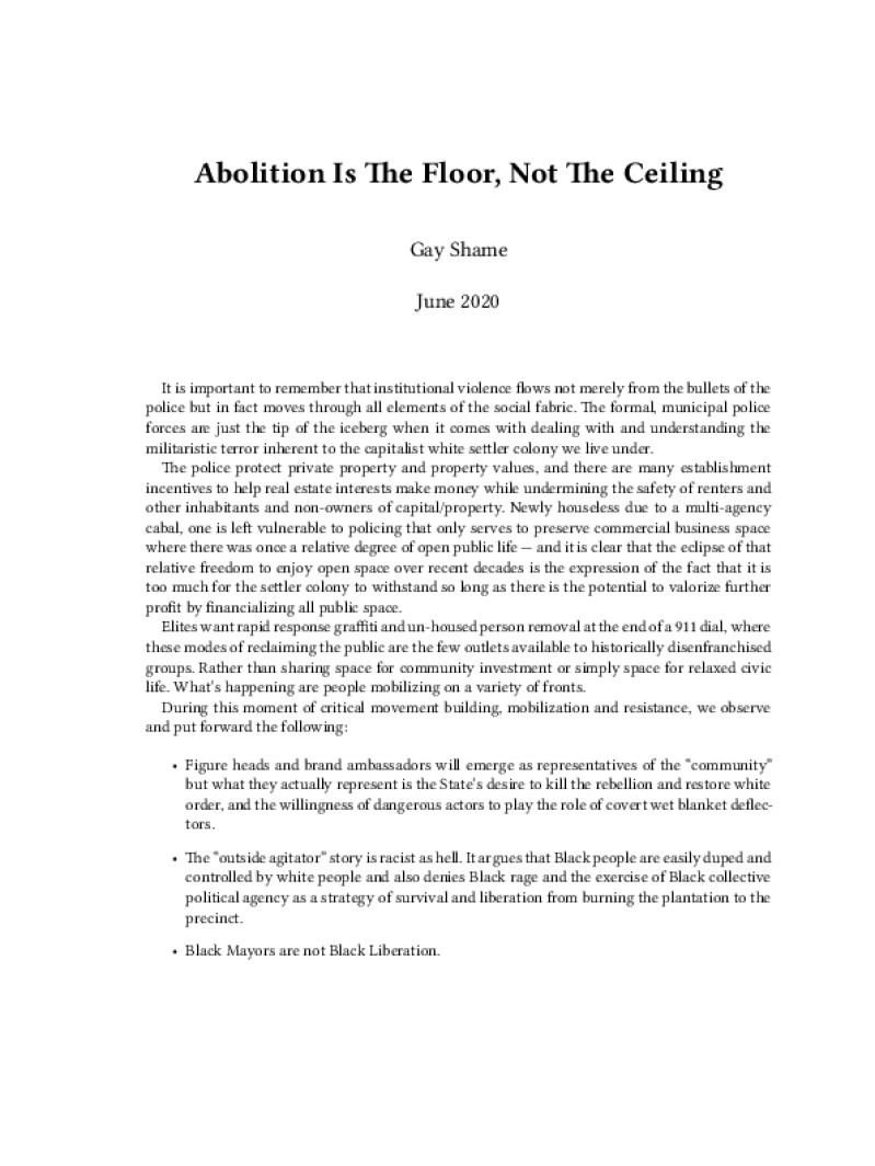 Zine Abolition Is The Floor, Not The Ceiling Author: Gay ShamePublished: June 2020Language: enCatalog: The Anarchist Library3 pages. Read online: html • pdf •imposed pdf • a4 pdf • epub • muse • tex Share: We mail all zines to incarcerated people for free.