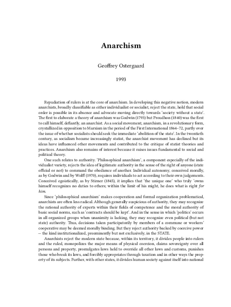 Zine Anarchism Author: Geoffrey OstergaardPublished: 1993Language: enCatalog: The Anarchist Library5 pages. Read online: html • pdf •imposed pdf • a4 pdf • epub • muse • tex Share: We mail all zines to incarcerated people for free.
