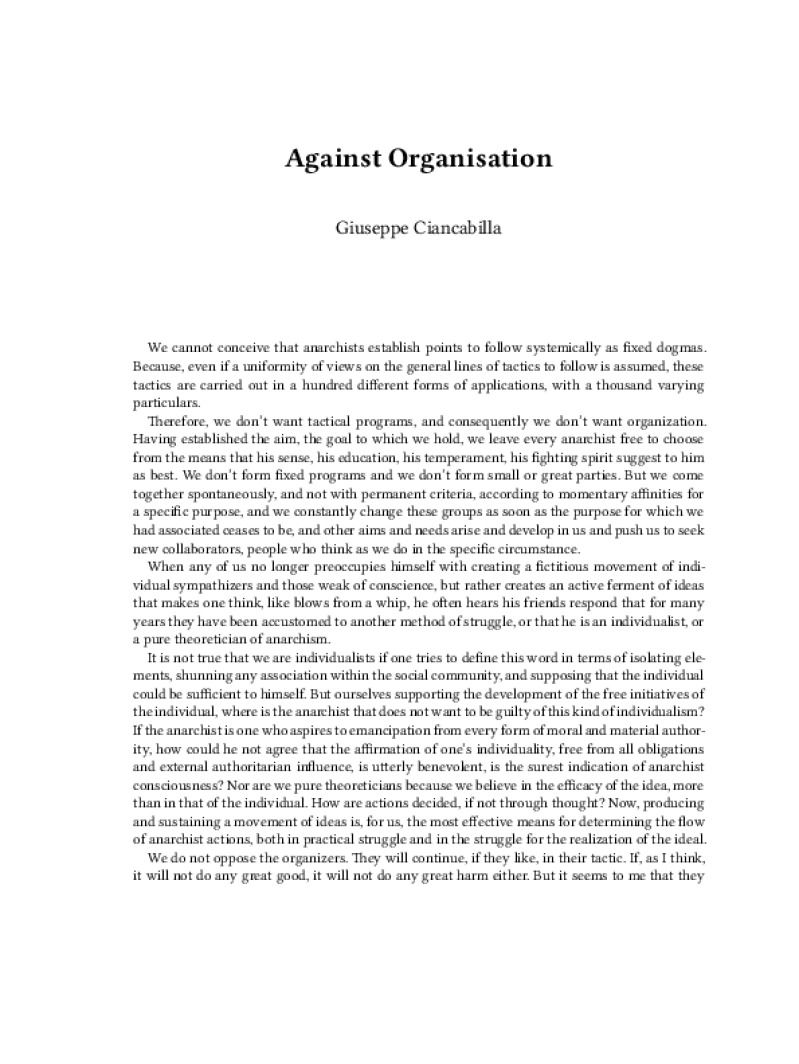 Zine Against Organisation Author: Giuseppe CiancabillaLanguage: enCatalog: The Anarchist Library3 pages. Read online: html • pdf •imposed pdf • a4 pdf • epub • muse • tex Share: We mail all zines to incarcerated people for free.