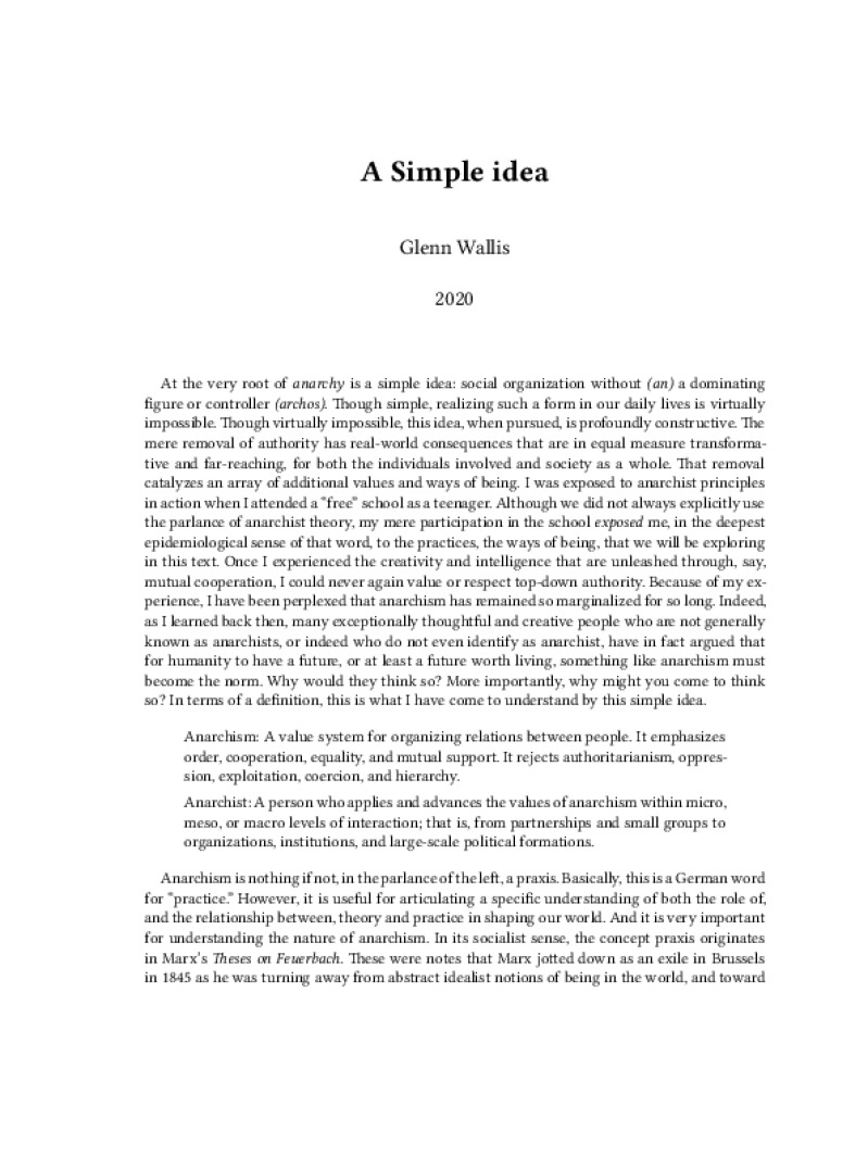 Zine A Simple idea Author: Glenn WallisPublished: 2020Language: enCatalog: The Anarchist Library6 pages. Read online: html • pdf •imposed pdf • a4 pdf • epub • muse • tex Share: We mail all zines to incarcerated people for free.