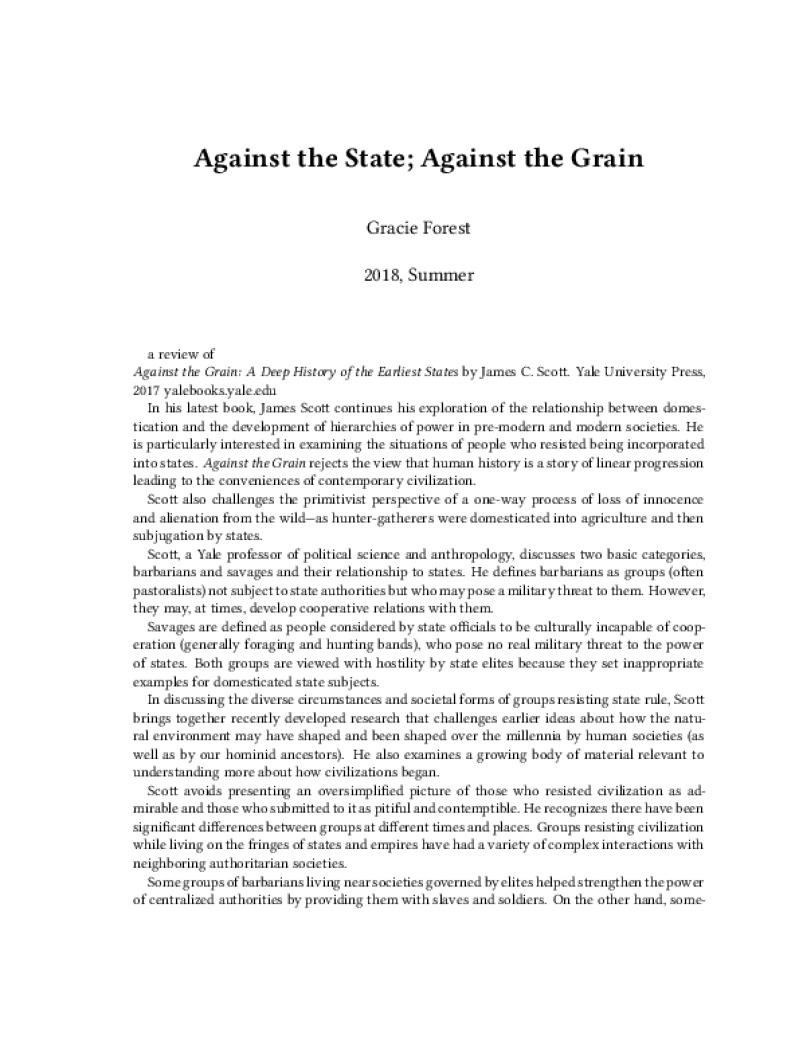 Zine Against the State; Against the Grain Author: Gracie ForestPublished: 2018, SummerLanguage: enCatalog: The Anarchist Library4 pages. Read online: html • pdf •imposed pdf • a4 pdf • epub • muse • tex Share: We mail all zines to incarcerated people for free.