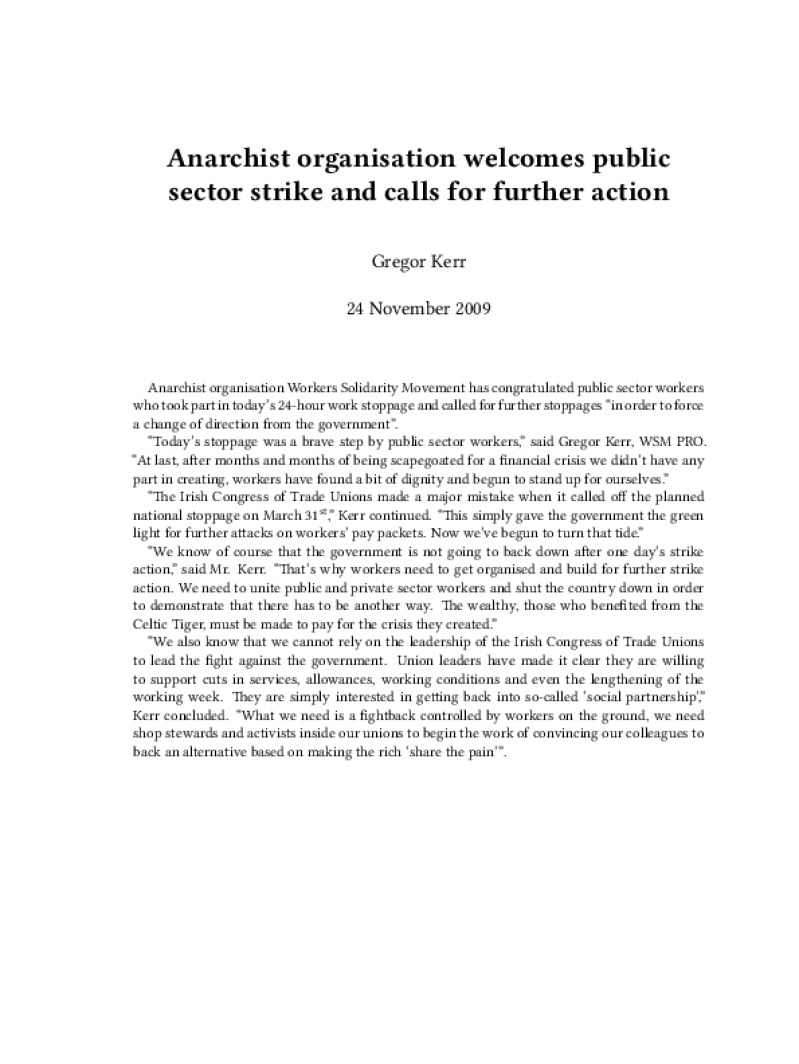 Zine Anarchist organisation welcomes public sector strike and calls for further action Author: Gregor KerrPublished: 24 November 2009Language: enCatalog: The Anarchist Library2 pages. Read online: html • pdf •imposed pdf • a4 pdf • epub • muse • tex Share: We mail all zines to incarcerated people for free.