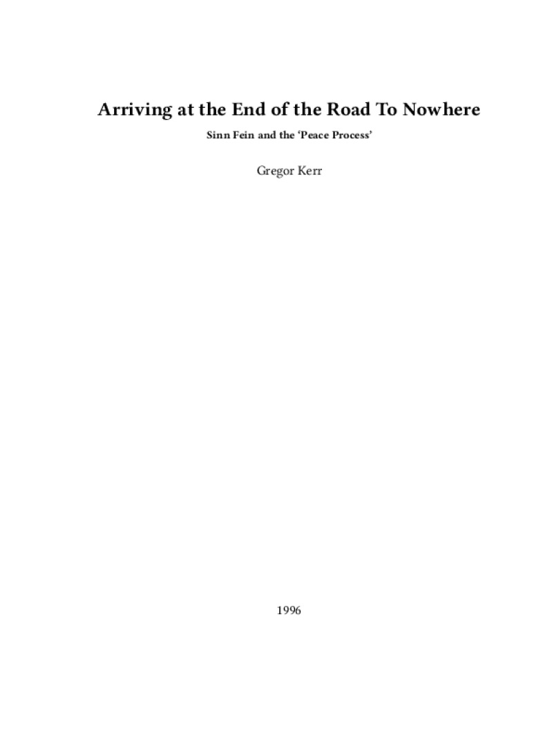 Zine Arriving at the End of the Road To Nowhere Author: Gregor KerrPublished: 1996Language: enCatalog: The Anarchist Library14 pages. Read online: html • pdf •imposed pdf • a4 pdf • epub • muse • tex Share: We mail all zines to incarcerated people for free.