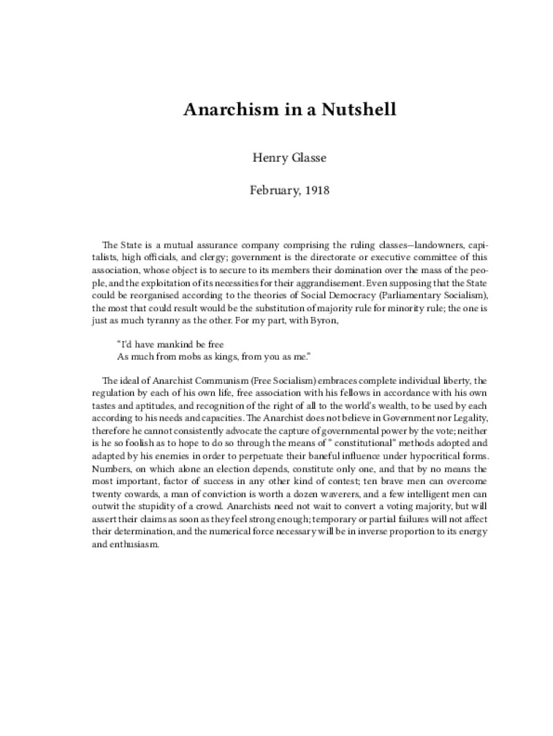 Zine Anarchism in a Nutshell Author: Henry GlassePublished: February, 1918Language: enCatalog: The Anarchist Library2 pages. Read online: html • pdf •imposed pdf • a4 pdf • epub • muse • tex Share: We mail all zines to incarcerated people for free.