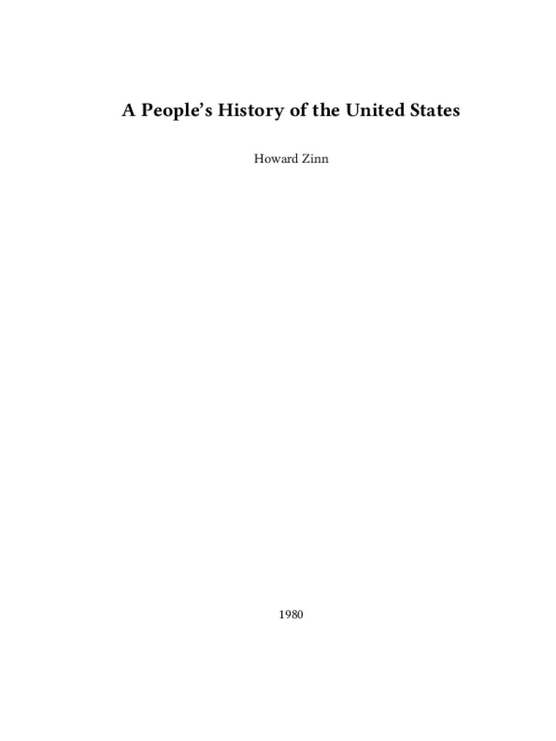 Zine A People's History of the United States Author: Howard ZinnPublished: 1980Language: enCatalog: The Anarchist Library476 pages. Read online: html • pdf •imposed pdf • a4 pdf • epub • muse • tex Share: We mail all zines to incarcerated people for free.