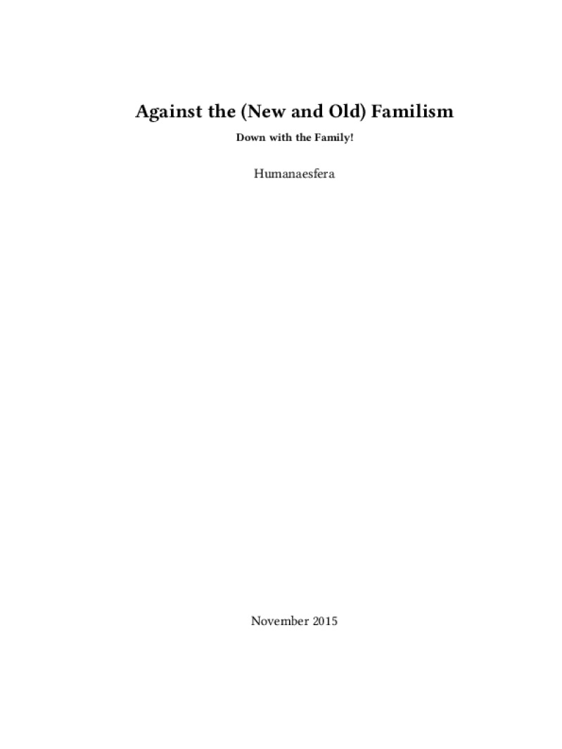 Zine Against the (New and Old) Familism Author: HumanaesferaPublished: November 2015Language: enCatalog: The Anarchist Library8 pages. Read online: html • pdf •imposed pdf • a4 pdf • epub • muse • tex Share: We mail all zines to incarcerated people for free.