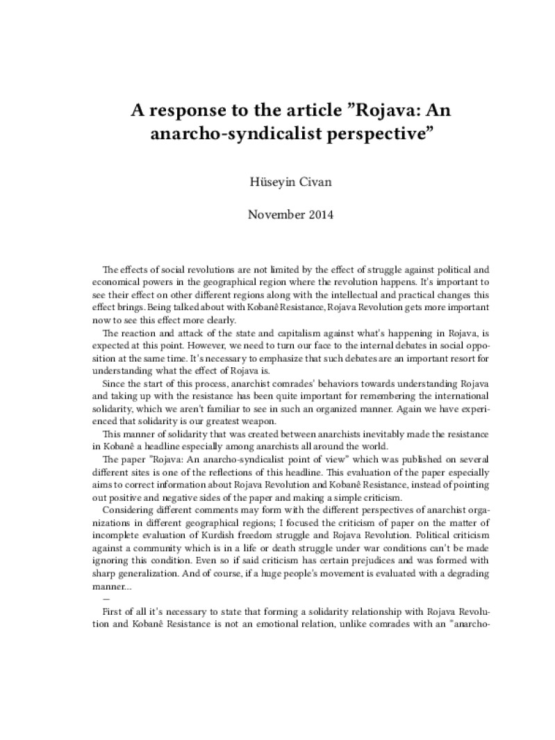 Zine A response to the article "Rojava: An anarcho-syndicalist perspective" Author: Hüseyin CivanPublished: November 2014Language: enCatalog: The Anarchist Library4 pages. Read online: html • pdf •imposed pdf • a4 pdf • epub • muse • tex Share: We mail all zines to incarcerated people for free.