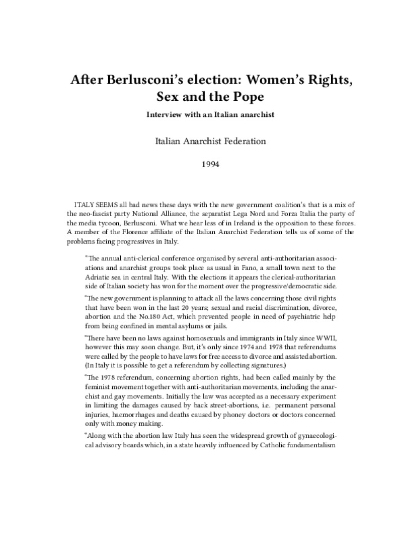 After Berlusconi’s election: Women’s Rights, Sex and the Pope