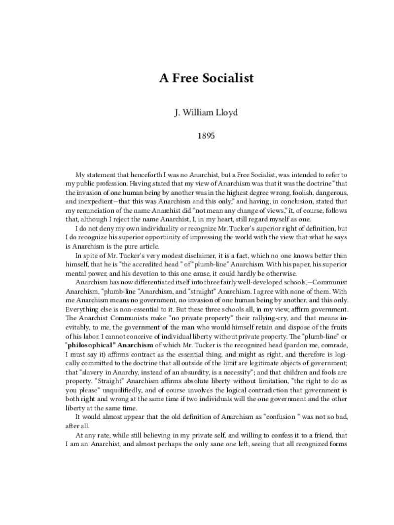 Zine A Free Socialist Author: J. William LloydPublished: 1895Language: enCatalog: The Anarchist Library3 pages. Read online: html • pdf •imposed pdf • a4 pdf • epub • muse • tex Share: We mail all zines to incarcerated people for free.