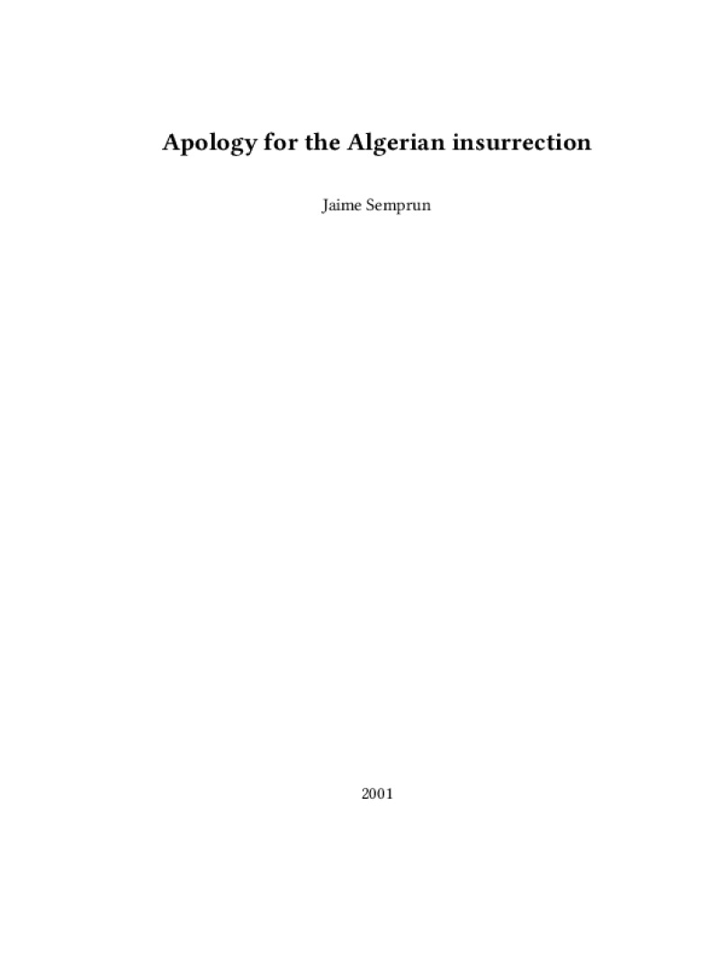 Zine Apology for the Algerian insurrection Author: Jaime SemprunPublished: 2001Language: enCatalog: The Anarchist Library9 pages. Read online: html • pdf •imposed pdf • a4 pdf • epub • muse • tex Share: We mail all zines to incarcerated people for free.