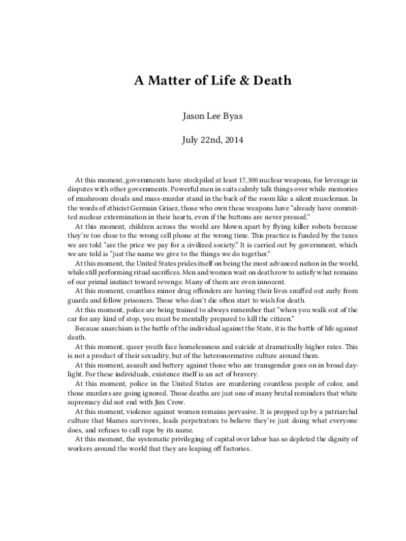 Zine A Matter of Life & Death Author: Jason Lee ByasPublished: July 22nd, 2014Language: enCatalog: The Anarchist Library3 pages. Read online: html • pdf •imposed pdf • a4 pdf • epub • muse • tex Share: We mail all zines to incarcerated people for free.