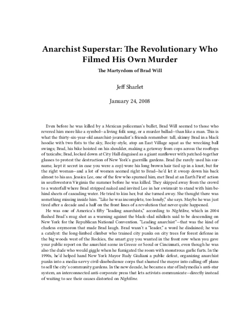 Zine Anarchist Superstar: The Revolutionary Who Filmed His Own Murder Author: Jeff SharletPublished: January 24, 2008Language: enCatalog: The Anarchist Library13 pages. Read online: html • pdf •imposed pdf • a4 pdf • epub • muse • tex Share: We mail all zines to incarcerated people for free.